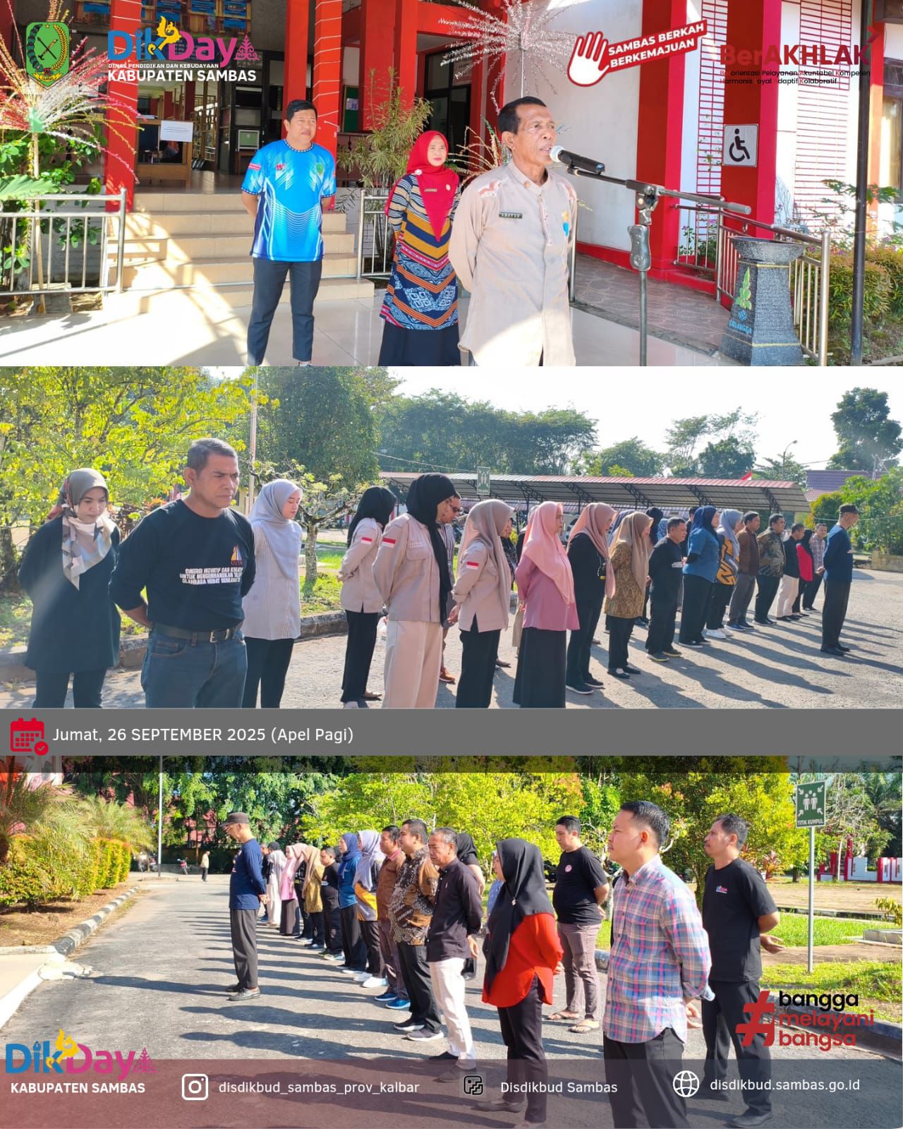Sambas – Apel pagi pada Jumat, 26 September 2025, digelar di lingkungan Dinas Pendidikan dan Kebudayaan Kabupaten Sambas, dipimpin langsung oleh Kepala Dinas, Arsyad, S.Pd., M.M. Kegiatan ini dihadiri oleh seluruh pejabat dan staf di lingkungan dinas.