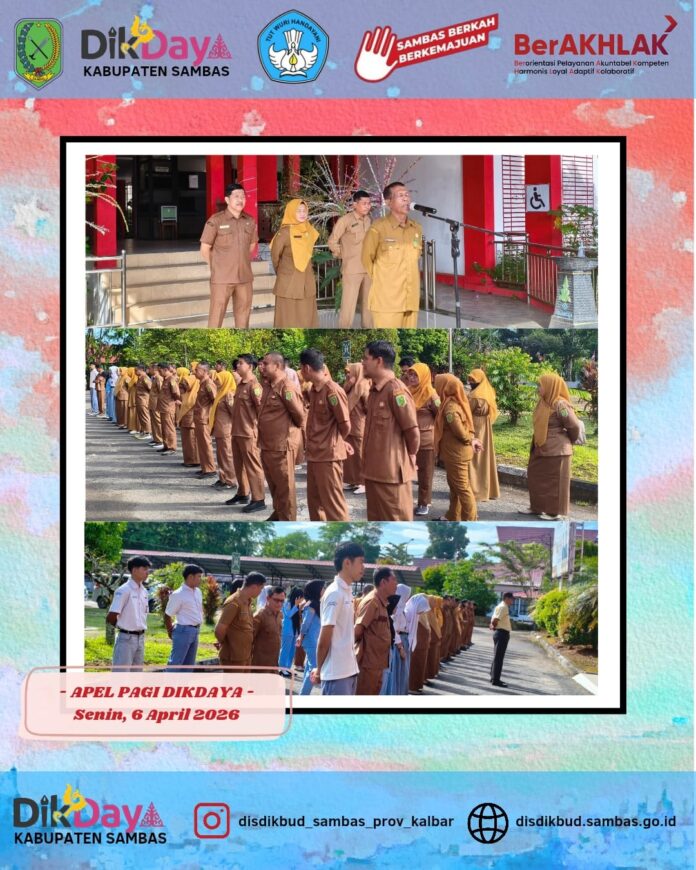 SAMBAS – Mengawali pekan pertama di bulan April, Dinas Pendidikan dan Kebudayaan Kabupaten Sambas menggelar apel pagi rutin pada Senin, 6 April 2026. Bertempat di halaman kantor Disdikbud, apel dipimpin langsung oleh Kepala Dinas Pendidikan dan Kebudayaan Kabupaten Sambas dan diikuti oleh seluruh jajaran pegawai, mulai dari pejabat struktural hingga fungsional.